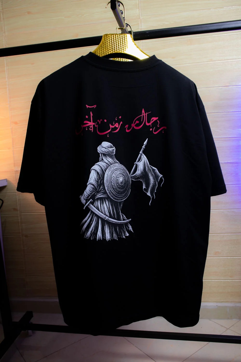 تيشرت اوفرسايز فاخر مصنوع من 100% قطن ناعم بتصميم مستوحى من رجال من زمن آخر، رجال حملوا رايات المجد والإيمان. الطباعة بتقنية عالية الجودة تُبرز تفاصيل المحارب العربي بوضوح مذهل وألوان تدوم طويلاً، لتعكس قوة التاريخ وعظمة الهوية